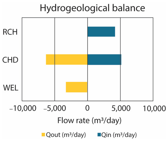 To simulate the numerical flow model for an average groundwater heads scenario, a steady-state model with a starting time equal to “−1 s” and an ending time equal to “0 s” was set up. As far as boundary conditions, two Specified-Heads (CHDs, usually associated with the constant head boundary) were assigned, with the first with values ranging between 4 and 35 m on the western part of the study area and the second set at 0 near the sea coastline, to represent the sea level. Recharge (RCH) values were calculated using rainfall data during the selected period. The same process was applied to the WEL package data, assigning a specific pumping rate to each active well (approximately 150). Groundwater heads measured at the monitoring wells network (about 300) were imported using the Observation package.