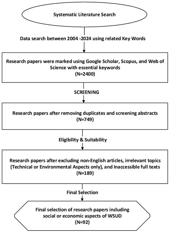 The search process began with the identification of relevant literature using established academic databases, including Scopus, Web of Science, and Google Scholar. A set of predefined keywords was employed to capture a broad range of studies, including “Water Sensitive Urban Design”, “WSUD social impacts”, “WSUD economic impacts”, “stormwater management”, “urban planning”, “cost–benefit analysis”, and “community well-being”.