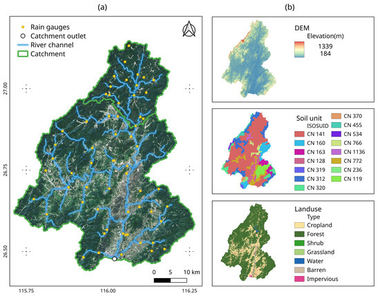 Figure 2 is the overview of the Ningdu catchment, showing its river network, rain gauge distribution, DEM, soil type, and land use. The catchment lies between 35 and 693 m in elevation and consists of river networks, which are tributaries of the Mei River. The catchment is located in the subtropical monsoon region, with forest and cropland as the primary land-use types. Human influence on the hydrological processes is relatively limited. According to the SOTER China database [