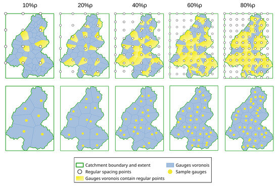 When installing rain gauges within a catchment, it is common to maximize their effectiveness by distributing rain gauges as evenly as possible when conditions permit. Without considering special circumstances, the density of rain gauges in a catchment can be estimated by dividing the catchment area by the number of gauges. Some GIS tricks can be employed to generate different rain gauge density scenarios. In Algorithm 1, it is assumed that rain gauge density can be measured by the average distance between gauges. By scaling the estimated average distance of existing gauges with factors of 0.8, 0.6, 0.4, 0.2, and 0.1, regular spacing points that mimic the distribution of sampled gauges in these scenarios can be generated. If an existing rain gauge whose Voronoi polygon contains a regular spacing point, this gauge will be chosen to use. This approach simplifies real-world scenarios based on the Voronoi polygon theory. Ultimately, five generated rain gauge density scenarios and 1 existing gauge scenario are present, corresponding to the number of gauges being used are 62, 41, 32, 22, 13, and 6, and the estimated control area of each gauge is 38 km2, 57 km2, 74 km2, 107 km2, 182 km2, and 394 km2, respectively. Notice that from 100% density to 80% density, up to 20 gauges are excluded from the sample. This occurs because existing rain gauges are not perfectly uniformly distributed, some closely spaced gauges are filtered out by the algorithm.