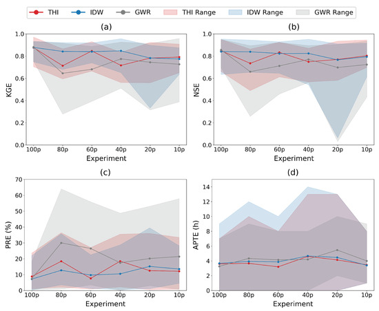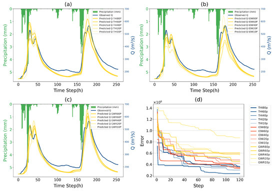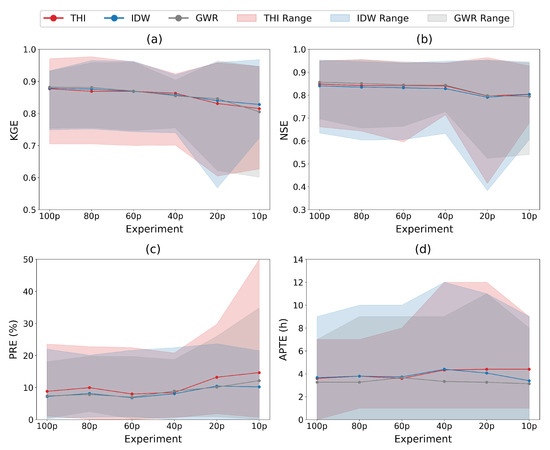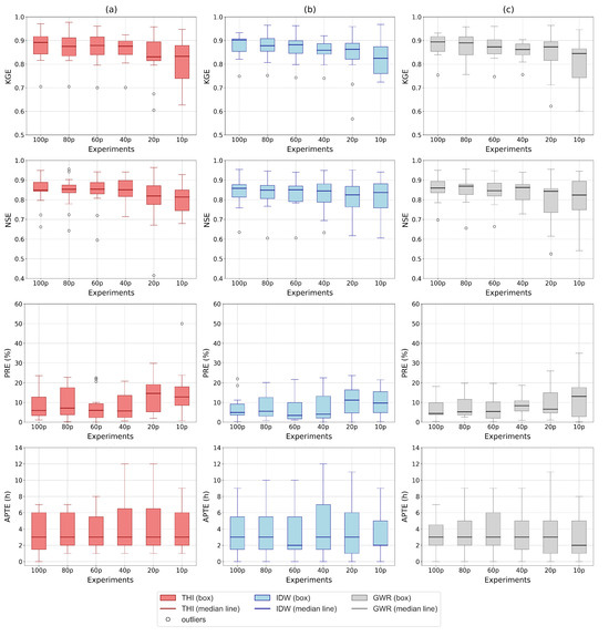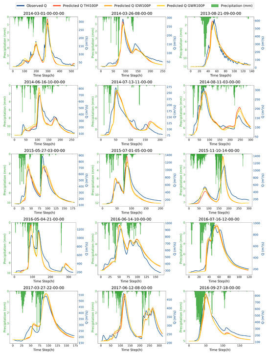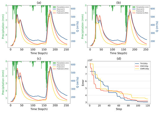 Gauges are selected from a scale of the average distance, which could be regarded as a scale of gauge density. For simplicity, use an abbreviated notation for experiment naming, e.g., “100P” represents the experiment on existing gauge density (), “THI80P” represents the experiment on gauges sampled by intersection with spacing points () and use THI to interpolate distributed rainfall surfaces. Combining six gauge density conditions with three spatial interpolation methods, there are 18 scenarios in total. The model parameters are optimized only for scenarios THI100P, IDW100P and GWR100P in the same PSO settings, as the characteristics of their interpolated surface are different. The performance of the experiments THI100P, IDW100P, and GWR100P will be evaluated first, serving as the reference baseline for observing how the model’s performance changes under varying rain gauge density conditions.