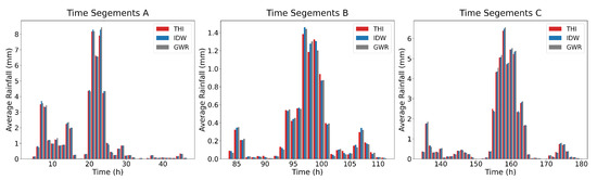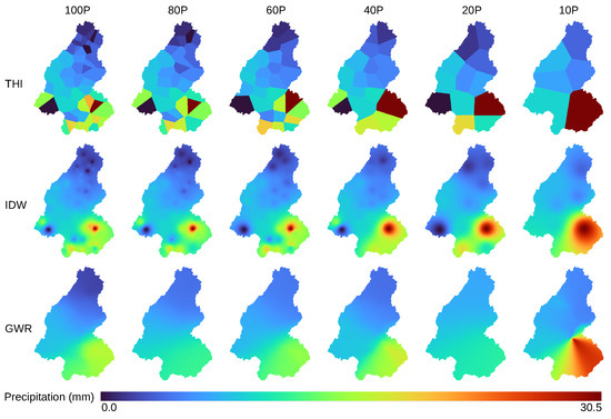 37]; this phenomenon often occurs when there are few gauges and minor rainfall, leading to inconsistency in the interpolated rainfall surfaces. In flood forecasting, operators often lack sufficient knowledge to handle these conditions. For these reasons, simple and automatic methods are still commonly used in practice. Considering the ease of use and applicability, this study selects THI, IDW, and GWR for research. They are both representative and widely used in practice. The theoretical backgrounds are briefly introduced below. More detailed information can be found in [