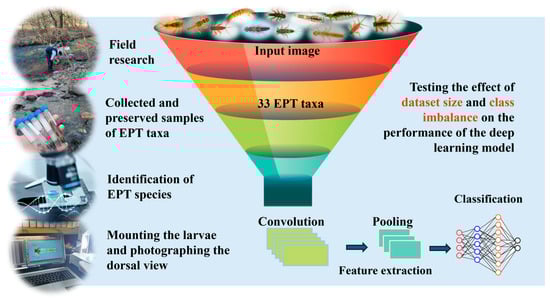 Figure 1 provides an overview of the steps taken to construct the training datasets for the CNN models. The larvae of EPT species were collected alongside other macroinvertebrates as part of hydrobiological studies in aquatic ecosystems within Serbia, during the development of a freshwater biomonitoring program for Serbian surface waters. The sampling sites included various lotic and lentic habitats from the Middle Danube Basins [28]. The larvae were collected from different substrate types using a Surber sampler and preserved in 96% ethanol. They were transported and stored at the Department of Biology and Ecology, Faculty of Science, University of Kragujevac, Republic of Serbia. After separating the collected samples from extraneous materials, taxonomic identification was performed. The material was identified at the species level using relevant identification literature [29,30,31,32] by experts for this group of insects. Morphological identification of bioindicators is especially challenging for immature and early life stages [17]. To address this, our study focused on late instar larvae, which have well-developed and clearly visible morphological traits that enable accurate identification. In total, we gathered 100 individuals for each of the 33 target species (Table 1; Figure 2). Each individual was positioned in a dorsal view and photographed using either a Nikon SMZ800 stereomicroscope (Nikon Corporation, Tokyo, Japan) equipped with a Leica Flexacam C3 microscope camera (Leica Microsystems, Wetzlar, Germany) or a Nikon D900 camera (Nikon Corporation, Tokyo, Japan). According to the previous study [17] the dorsal view of these larvae provides morphological characteristics that are sufficiently informative for reliable identification. We completed our training dataset with a total of 3330 photos (one image per individual).