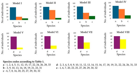 To assess how the number of images (individuals) affects classification accuracy, we trained a series of eight CNN models with three different configurations. In the first configuration we varied the number of individuals in the training set from 10 to 80. In the second configuration, eight subsets were randomly created to form a series of smaller training sets, allowing us to investigate the effects of dataset imbalance on the performance of species classification models. For all eight models, one species group contained 80 individuals, while the other species had progressively smaller sample sizes of 60, 40, 20, or 10 individuals, following the pattern outlined in Figure 3. In the third configuration, we used the same unbalanced dataset and applied the oversampling technique, which duplicates random examples from the minority class to balance the dataset.