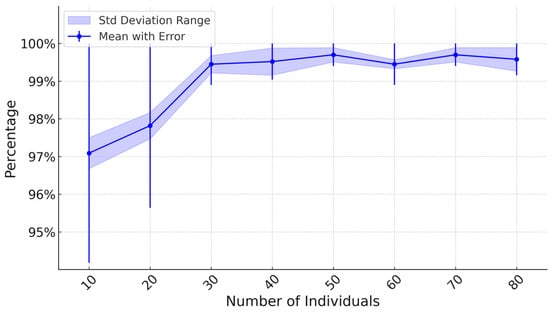 The classification accuracy of the CNN model across five training repetitions with varying sample sizes per class (ranging from 10 to 80) significantly varied (ANOVA, F = 49,149, p < 0.001) (Figure 4). The model achieved a remarkable mean classification accuracy of 97.09% (range: 96.36–97.58%) when trained on only 10 individuals per each of the 33 EPT species. This accuracy was significantly improved to 99.45% with larger training dataset sizes of 30 individuals per species (Tukey’s HSD, p < 0.01). The highest accuracy was 99.70% (range: 99.39–100%) when 50 individuals per species were used for training. The same highest average accuracy of 99.70% was also confirmed with 70 individuals per species used for training, but it decreased to 99.58% when the number of individuals increased to 80. However, the accuracy percentage remained high, so these oscillations can be considered negligible (Figure 4). In addition, low standard deviation values (Std.) indicate that the results are consistent across different tests, which means that the model is stable and reliable.