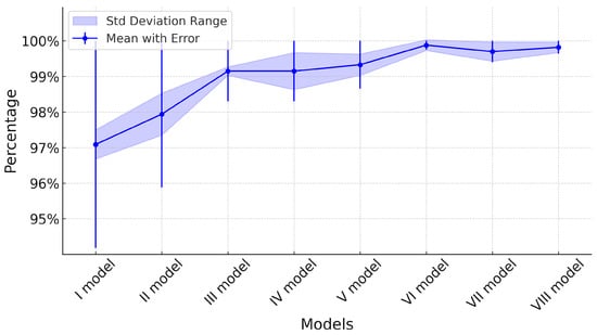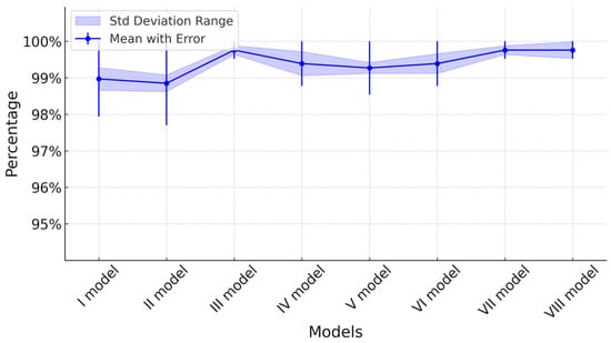 The application of the oversampling technique significantly improved classification accuracy in Models I, II, and III (t-test, p < 0.05; Figure 6). Accuracy increased from 97.09% ± 0.41% to 98.97% ± 0.31% in Model I, from 97.94% ± 0.59% to 98.85% ± 0.23% in Model II, and from 99.15% ± 0.12% to 99.76% ± 0.12% in Model III (Figure 6). In contrast, Model IV showed a slight but significant decrease in accuracy, dropping from 99.88% ± 0.15% to 99.39% ± 0.27% (t-test, p < 0.05).