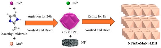 A total of 0.18 g of Ni (NO3)2·6H2O was added to 50 mL of anhydrous ethanol that had been mixed with 160 mg of produced Co-Mn-ZIF (2:1). Next, the treated nickel foam was added. The mixture was refluxed for one hour at 90 °C. Centrifugation was then performed once it had cooled to ambient temperature. The resulting product was washed with ethanol and dried at 70 °C for 12 h to synthesize NF@CoMnNi-LDH. The preparation diagram is shown in Figure 1.