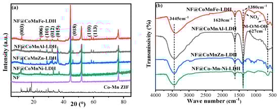 XRD patterns (a) and FT-IR spectra (b) of different LDHs/NF.