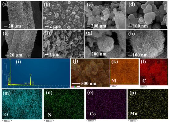 SEM images of NF (a–d), NF@CoMnNi-LDH (e–h), EPX (i) and elemental mapping images of NF@CoMnNi-LDH (j–p).