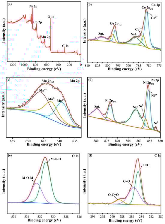 XPS was utilized to analyze the elemental composition of nickel foam post-loading. As can be seen from the full spectrum of the NF@CoMnNi-LDH sample in Figure 4a, the synthesized loading sample consisted of the elements Ni, Co, Mn, O and C. The findings indicated that CoMnNi-LDH particles exhibited favorable growth on the surface of the NF framework. Concerning the high-resolution XPS spectra of different elements, Figure 4b shows two satellite peaks (Sat) and two major peaks (Co 2p 1/2 and Co 2p 3/2), indicating the presence of Co2+ and Co3+ [31,32]. For Ni 2p spectra, there were also subpeaks of 2p 3/2 and 2p 1/2 of Ni2+ (855.6 eV and 873.4 eV) and Ni3+ (856.9 eV and 874.8 eV) [33]. In addition, the satellite peak at 852.1 eV belonged to Ni0 [34], probably from NF. The peaks in the XPS spectrum of Mn 2p with binding energies of 639.1 eV, 642.6 eV and 645.90 eV belonged to Mn2+, Mn3+ and Mn4+ in Mn 2p 3/2 [35,36]. In the XPS spectra of O 1s, two fitting peaks were located at 531.1 and 532.5 eV, which were derived from the adsorbed oxygen (M-O-M) (M = Ni, Co, and Mn) and the absorbed hydroxyl groups of metal oxides, respectively [37,38]. The peaks of binding energy at 284.7, 285.6 and 288.6 eV in the XPS spectrum of C 1s corresponded to C=C, C=O and O–C=O bonds, respectively. Since the spectra of different elements in NF@CoMnNi-LDH were similar to those of the CoMnNi-LDH catalyst, it can be confirmed that the particles on the surface of NF belonged to CoMnNi-LDH.