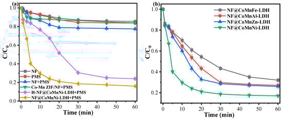 The degradation of ENR using various catalysts activated PMS was investigated, and the results are shown in Figure 5. As shown in Figure 5a, the concentration of ENR exhibited minimal change when PMS was applied independently, suggesting that PMS remained stable in a solution devoid of a catalyst. After the addition of NF, only 22.5% of the ENR was degraded, indicating that the NF-induced activation of PMS catalytic activation was negligible. In addition, the adsorption contribution of NF samples was quite limited. Compared with the hydrothermally synthesized NF@CoMnNi-LDH (H-NF@CoMnNi-LDH), the degradation process of the derivatized NF@CoMnNi-LDH catalyst was significantly accelerated, i.e., 84% of the ENR was degraded within 30 min. Figure 5b shows that NF@CoMnNi-LDH had the most prominent catalytic effect among the different metal hydrotalcite nickel foams synthesized by the derivatization method.