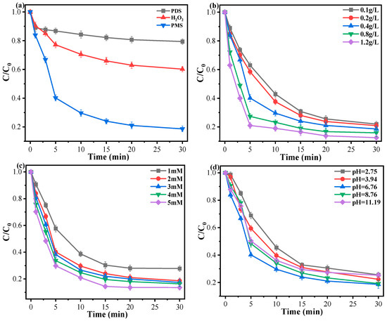 Effect of different oxidants (a), catalyst dosing (b), PMS dose (c) and pH (d) on the degradation of ENR (experimental conditions: ENR = 50 mg/L, PMS = 2 mM, M-Co-Mn-Ni/NF = 0.4 g/L, initial pH = 6.76); the error bar represents the standard deviation.