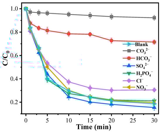 Effects of inorganic ions H2PO4−, HCO3−, NO3−, Cl−, CO32− and SO42− on the degradation of enrofloxacin by NF@CoMnNi-LDH-activated PMS; the error bar represents the standard deviation.