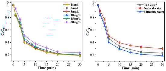 Wastewater contained significant quantities of natural organic matter (NOM). A representative sample of humic acid (HA) was selected to investigate the impact of NOM on catalytic processes. As shown in Figure 8a, the ENR degradation efficiency decreased by only about 7% at the highest concentration (20 mg/L), indicating that the catalyst had good stability. For catalysts used in different water matrices, the removal of ENR was reduced to 77.2% in tap water and 69.9% in natural water. Lake water contained natural organic substances in addition to ions, which may reduce the availability of free radicals and lead to a modest decrease in degradation efficiency; all the water quality parameters were shown in Table S2. Experiments on organic matter and water matrix showed that the catalyst had good stability and can be applied in natural water.