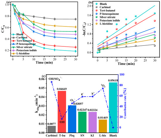 The contribution of specific active substances to ENR degradation was studied by chemical quenchers, and the quenchers of •OH, •OH/SO4•−, O2•−, 1O2, e− and h+ were tert-butanol (TBA), methanol (MeOH), p-benzoquinone (PBQ), L-histidine, silver nitrate and potassium iodide. Figure 9a demonstrates the influence of various quenching agents on the degradation of ENR within the NF@CoMnNi-LDH/PMS system. The ENR degradation efficiency of the solution containing TBA and MeOH was about 74.4% and 25.3%, respectively, demonstrating that the reaction involved both •OH and SO4•−, but the contribution of •OH was quite limited, and SO4•− played a more important role than •OH. The introduction of PBQ led to a significant inhibition of the process, resulting in an overall degradation efficiency of 58.9%. This demonstrated that O2•− was integral to the reaction mechanism. Furthermore, the introduction of a minimal dosage of L-histidine led to a suboptimal oxidation efficiency of 39.2%, indicating that singlet oxygen (1O2) was the principal free radical species engaged in the process of oxidation. Meanwhile, the degradation efficiency decreased to 47.3% and 52.4% after the addition of silver nitrate and potassium iodide, indicating that e− and h+ also had a significant impact in the deterioration process. According to the formula for calculating the contribution rate (Equsation (1)), the contribution rates of •OH/SO4•−, •OH, O2•−, e−, h+ and 1O2 were 85.97%, 16.35%, 45.59%, 58.22%, 58.63% and 73.85%, respectively (Figure 9b, c). Therefore, SO4•−, 1O2, e− and h+ were the main active substances used for ENR degradation in the NF@CoMnNi-LDH/PMS system, while •OH and O2•− were also involved in the reaction.