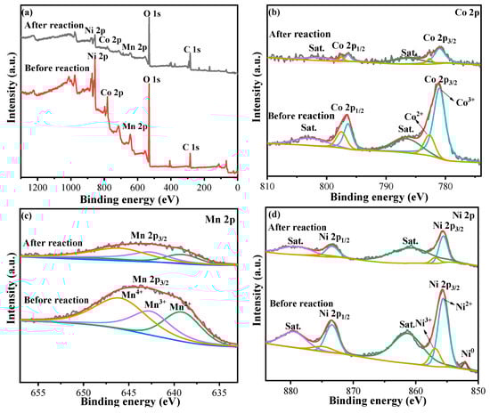 Figure 10a shows the coexistence of the C 1s, O 1s, Mn 2p, Co 2p and Ni 2p peaks in the compounds before and after the reaction, indicating that NF@CoMnNi-LDH had good stability. As shown in the XPS characterization of the catalyst after the reaction (Figure 10b–d), a significant change in the relative area ratios of Co(II)/Co(III), Mn(II)/Mn(III)/Mn(IV) and Ni(II)/Ni(III) was indicated. In the NF@CoMnNi-LDH/PMS system, the activation of PMS involved mutual Mn + 1/Mn+ (M = Co, Mn, Ni) redox processes. Metal ions with diverse valence levels fulfilled the redox cycle and promoted the continuation of the reaction system. The O-O band of PMS was dissociated by active M(II) (M = Co and Ni), which produced SO4•− (Equation (2)). The oxidized M(III) was further involved in the activation of PMS to generate SO5•− (Equation (3)). For the oxidation process, the direct electron transfer of the Mn atom led to the reduction of ≡Mn4+ (≡Mn3+) (Equation (4)). At the same time, the reducing ≡Mn3+ (≡Mn2+) was involved in the activation of PMS to generate surface-bound SO4•− (Equation (5)). Since the redox potential of Mn3+/Mn2+ (E0 = 1.51 V) and Mn4+/Mn3+ (E0 = 0.15 V) was lower than that of Co3+/Co2+ (E0 = 1.81 V), thermodynamically Mn3+ and Mn2+ were favorable for the reduction of Co3+. The synergistic effects of various redox processes can expedite charge transfer, therefore facilitating the production of reactive oxygen species (ROS) and augmenting the activation process (Equations (6) and (7)). Following the reaction, the Ni (0) content decreased, suggesting that Ni (0) was an active factor in PMS activation; ≡Ni (0) can react with HSO5− to produce O2•− (Equation (8)). The resultant O2•− may then be converted to 1O2, the primary active ingredient (Equation (9)) [42].