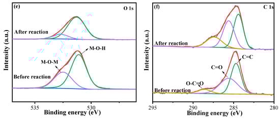 The detailed spectrum of C 1s is presented in Figure 10f. The binding energy peaks at 284.7, 285.6 and 288.6 eV in the XPS spectrum of C 1s corresponded to C=C, C=O and O-C=O bonds, respectively. Their relative contents in NF@CoMnNi-LDH before the reaction were 46.88%, 44.40% and 8.71%, respectively. However, after being used, they became 41.80%, 38.42% and 19.78%, respectively. This alteration verified the involvement of the carbon chemical group in the reaction process. C=O can facilitate the degradation of PMS and produce 1O2 (Equation (15)) [45]. After the reaction, a decrease in the proportion of C=O groups was observed, signifying that C=O was involved in the reaction. Table S1 shows the component and proportion of samples before and after the reaction calculated from XPS.