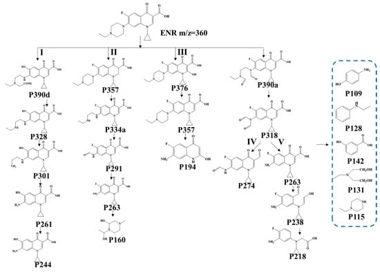 In pathway II, P357 was formed by ENR hydrogenation, and the highly reactive •OH breaks the C=C bond of P357 and opened the piperazine ring of P357 to generate P334a. When P334a was attacked by •OH, P291 with an amide group may have been formed. The formation of P262 involved a reaction on the cleaved piperazine ring and a series of cleavage reactions that further disrupted the piperazine moiety [48]. In the case of P160, the pathway occurred primarily in the quinolone core and includes a series of hydrolysis and cleavage reactions. Free radicals particularly targeted the quinolone ring of enrofloxacin in pathway III, converting it to P357 by a dihydroxylation process. This resulted in P376. Following the oxidation process, P195 was created by converting P357 via the opening of the piperazine ring and the removal of the cyclopropyl and aldehyde groups.