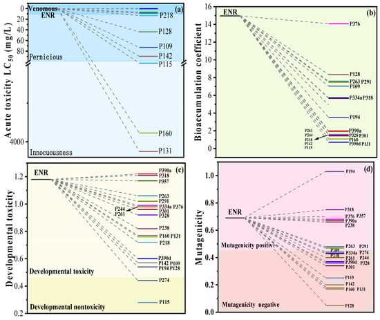 The toxicity estimation software tool (T.E.S.T., version 5.1.2) was employed to evaluate the ecotoxicity of enrofloxacin and its by-products to ascertain their potential hazard to ecosystems. As can be seen from Figure 13a, most of the intermediates had greater LC50 values than enrofloxacin for fathead fish, which meant a reduction in toxicity. It was important to note that P115, P160 and P131 were not harmful. The bioaccumulation coefficients of all intermediate products were lower than enrofloxacin (Figure 13b). In addition, the developmental toxicity of other intermediates was greatly reduced. Except for P390a and P318, the developmental toxicity of the other intermediate products was inferior to that of enrofloxacin (Figure 13c). For mutagenicity (Figure 13d), the mutagenicity of the intermediates was lower except for P318 and P194, with more than half of the intermediates being mutagenic. Despite the presence of certain toxic by-products, the overall biological toxicity was diminished relative to enrofloxacin, necessitating more treatment to attain complete detoxification of the enrofloxacin solution.