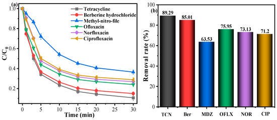 In addition to the degradation of ENR, the degradation prevalence of the NF@CoMnNi-LDH catalyst by activating PMS was also investigated (Figure 14) for several typical antibiotics such as tetracycline, berberine hydrochloride, metronidazole and other quinolone antibiotics. Tetracycline and berberine hydrochloride can achieve a removal efficiency of 85–89% within 30 min, and a degradation rate of 76% can be achieved for other quinolone antibiotics such as ofloxacin; like enrofloxacin, metronidazole can also be removed by about 63%. The results showed that the NF@CoMnNi-LDH catalyst had good versatility for the degradation of antibiotics.