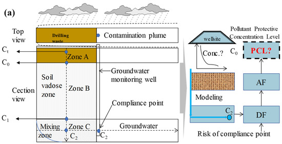 Pollutant protective concentration levels of pollutant based on migration pathway (a) and logic structure diagram (b). C2 is defined as the heavy metal and petroleum hydrocarbon concentration of the groundwater mixing zone (Zone C in (a)); C1 is defined as the heavy metal and petroleum hydrocarbon concentration of end of the soil vadose zone (end of Zone B in (a)); C0 is defined as the heavy metal and petroleum hydrocarbon concentration of the end of drilling waste (end of Zone A in (a)); PCL is defined as protective pollutant concentration levels; DF is defined as the pollutant dilution factor; AF is defined as the attenuation factor.