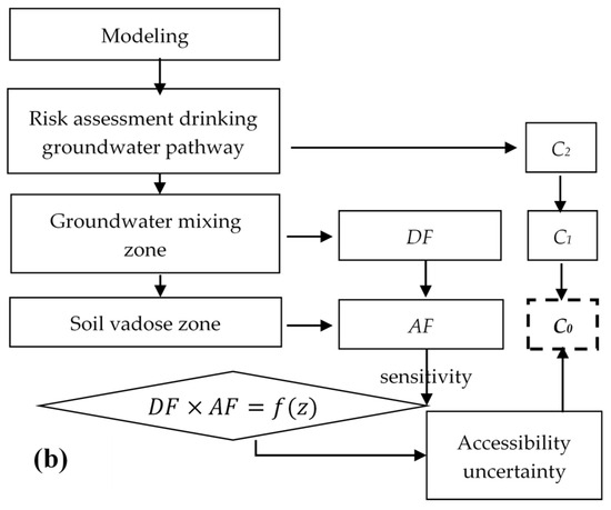 The model construction consisted of (1) the simulation of the process of pollutants entering the soil vadose zone and groundwater mixing zone with rainwater under the drilling waste bedded well site; (2) the adoption of a risk assessment of the drinking groundwater pathway to obtain the C2 pollutant concentration at the groundwater exposure point (Figure 1 and Figure 2); (3) the calculation of the pollutant dilution factor (DF) and C1 concentration at the groundwater mixing zone; (4) the calculation of the attenuation factor (AF) and C0 concentration at the soil vadose zone; (5) an analysis of the parameter sensitivity and the relationship between the DF, AF, PCL, and soil vadose zone thickness; and (6) an analysis of the PCL accessibility, uncertainty, and environmental significance. This study provides recommendations for decision-making regarding the utilization and disposal of drilling wastes and a methodology for an environmental risk assessment of solid waste disposal on land.