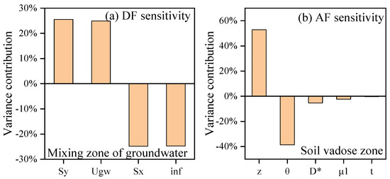 A sensitivity analysis [19] was performed based on the MCS [20,21,22,23] to evaluate the effect of parameters on the DAF. Figure 3 shows that four parameters, namely, the mixing zone thickness (Sy), the Darcy rate (Ugw), the length of the contaminated source (Sx), and the infiltration rate (inf), affected the DF value. The soil vadose zone thickness had a greater influence on the AF value. For all parameters, the soil vadose zone thickness was more easily screened or controlled during the actual paving well site scenarios. Therefore, it was necessary to describe the relationship between the different soil vadose zone thicknesses and the dilution attenuation coefficients.