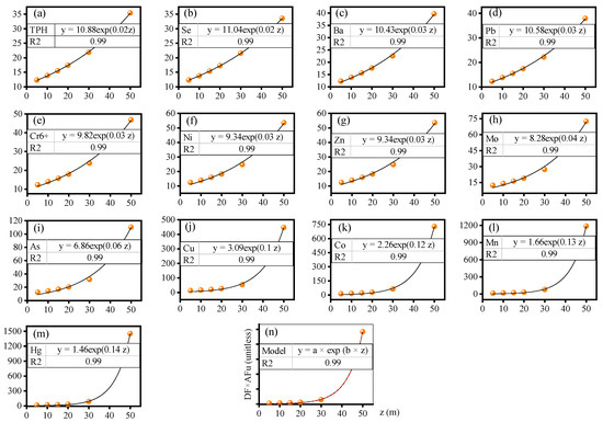 Relationship between DAF and soil vadose zone thickness (z): (a) DAF of TPH and z; (b) DAF of Se and z; (c) DAF of Ba and z; (d) DAF of Pb and z; (e) DAF of Cr6+ and z; (f) DAF of Ni and z; (g) DAF of Zn and z; (h) DAF of Mo and z; (i) DAF of As and z; (j) DAF of Cu and z; (k) DAF of Co and z; (l) DAF of Mn and z; (m) DAF of Hg and z; (n) DAF model general formula.
