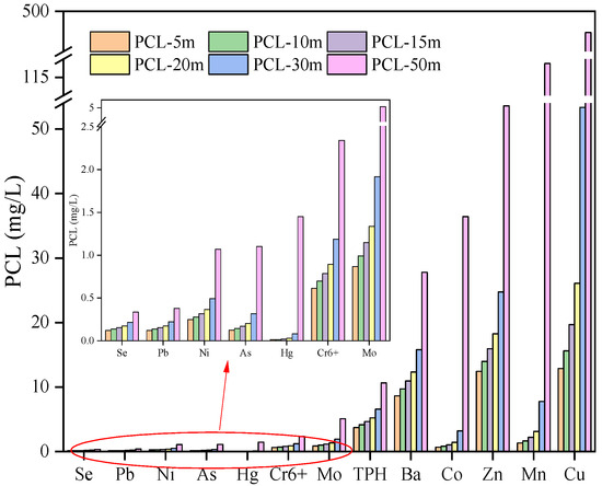 The pollutant PCL values of the drilling wastes corresponding to the different depths of the groundwater were calculated on the basis of the pollutant DAF to determine the applicability of the use of drilling wastes to pave well sites under different geologic conditions (different soil vadose zone thicknesses). In the case of an acceptable pollutant concentration risk at the groundwater compliance point (i.e., the heavy metal concentration was not higher than the standard value of the groundwater category III and the PH concentration was not higher than 0.3 mg/L), the inverse calculation of the PCLs of the drilling waste pollutant is as shown in Figure 5. Among them, the PCL values of the heavy metals Se, Pb, Ni, As, Hg, Cr6+, and Mo were low. However, the PCL values of Zn, Mn, and Cu were higher, which may have been related to their low toxicity or stronger adsorption by the soil. Therefore, heavy metals such as Se, Pb, Ni, As, Hg, Cr6+, and Mo are more of a concern.