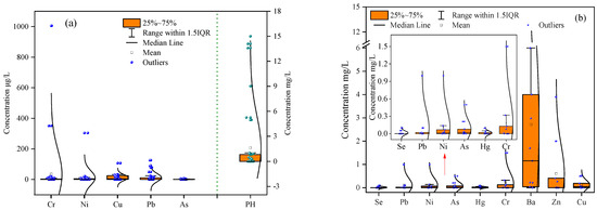 First, 42 treated drilling waste samples were collected from Northwest China and analyzed for the PH and heavy metal leaching concentrations. It was found that the Cr, Ni, Cu, Pb, and As leaching concentrations were low, and the leaching concentrations of other heavy metals were below the detection limit. The heavy metal and PH leaching concentrations are shown in Figure 6. The sampling and analysis results showed that the heavy metal leaching concentrations from drilling wastes met the PCL requirements. The upper 95% confidence limit of the PH leaching concentration (2.85 mg/L) is shown in Figure 6a, and the mean value was 1.62 mg/L. The distribution of the PCL of PH under different groundwater depths (5–50 m) ranged from 3.7 to 10.6 mg/L, as shown in Figure 5. Thus, the current PH leaching concentration of the drilling wastes met the PCL requirement.