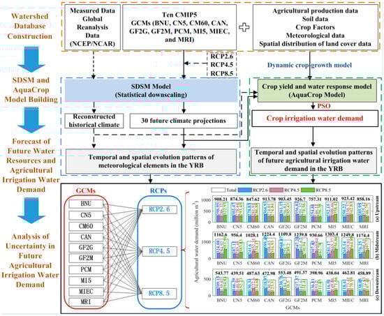 This article uses the Yellow River Basin as a case study and employs mathematical–statistical methods to reveal the spatiotemporal evolution of the main crop grain yields in the basin.; Second, by coupling Statistical Downscaling Models (SDSM) and ten General Circulation Models (GCMs) under CMIP5, the spatiotemporal evolution characteristics of future rainfall and evaporation in the watershed were estimated. Finally, a distributed crop-growth model (AquaCrop) was constructed based on county-level administrative regions to reveal the spatiotemporal evolution of agricultural irrigation water demand in the watershed and to elucidate the impact of climate model and climate-change scenario uncertainty on agricultural irrigation water demand uncertainty. It is worth noting that this article only considers the agricultural irrigation water requirements for the main crops in the watershed, excluding water consumption for socioeconomic development, industry, ecology, and daily life. In addition, to further reveal the temporal variation characteristics of precipitation and evaporation during different characteristic periods, this study divides the future period (2021–2100) under different GCMs and RCPs into three sub-periods: the near-term (2021–2050), the mid-term (2051–2080), and the long-term (2081–2100).