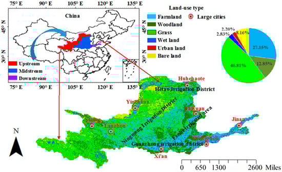 The Yellow River Basin, a vital grain-production area in China, plays a crucial role in the nation’s economic development and ecological security. The upstream Ningmeng and Hetao Irrigation Districts, along with the middle reaches Fenhe and Guanzhong Irrigation Districts, are key agricultural bases and major water resource users in the basin, tasked with significant agricultural irrigation. In 2018, the Yellow River’s total water intake was 51.62 billion cubic meters, with 32.77 billion cubic meters used for agricultural irrigation, accounting for 63.48% of the total. The Yellow River Basin supplies water to about 140 million people, including more than 50 large and medium-sized cities [].