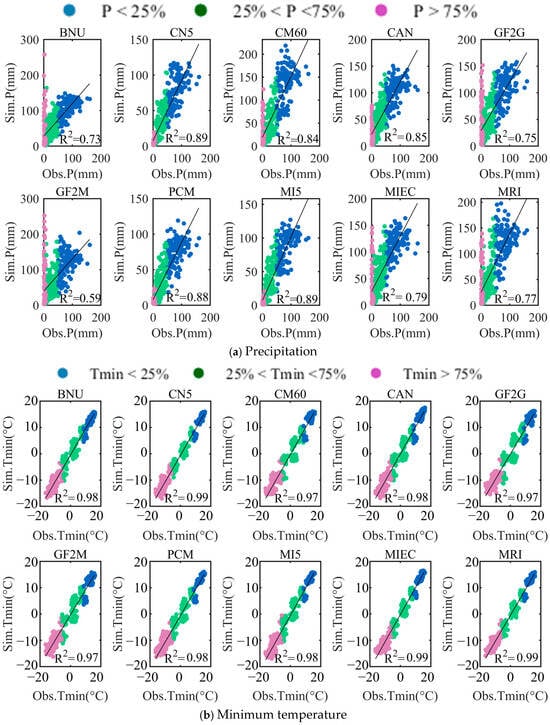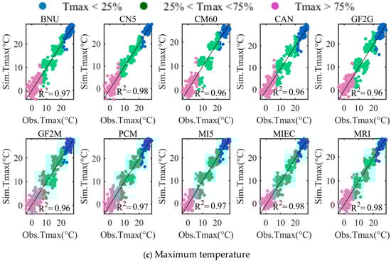 From Figure 3b,c, it is evident that during the historical period (1970–2005), the simulated monthly average minimum and maximum temperatures for 10 GCMs show a strong correlation with the measured values. The correlation between the simulated and measured minimum temperatures is stronger than that of the maximum temperatures. At the lowest temperature, the correlation coefficients between simulated and measured values in BNU, CN5, CM60, CAN, GF2G, GF2M, PCM, MI5, MIEC, and MRI models are 0.98, 0.99, 0.97, 0.98, 0.97, 0.97, 0.98, 0.98, 0.99, and 0.99, respectively.