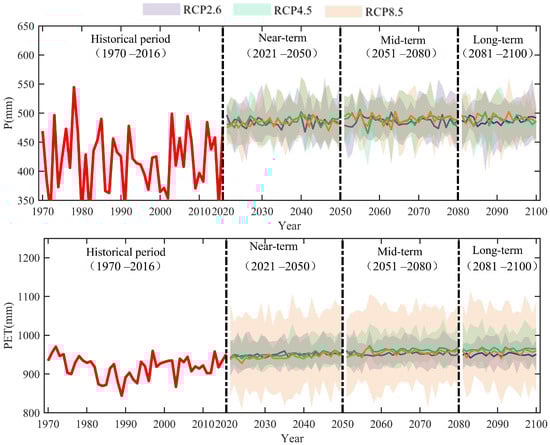 Figure 4 illustrates the temporal evolution of annual precipitation and potential evaporation across various GCMs and RCPs. The graph reveals: (1) Differences in annual precipitation and potential evaporation during distinct periods, with precipitation initially increasing then decreasing, while evaporation rises annually. This is mainly due to climate warming, temperature increases, and enhanced vegetation and soil transpiration; (2) Comparing temporal changes in annual precipitation under different climate scenarios (RCPs), the ensemble averages of annual precipitation under RCP2.6, RCP4.5, and RCP8.5 show relatively small differences. However, the confidence interval for RCP2.6 is the smallest, while RCP8.5 has the largest, indicating more extreme climate events. Similarly, the confidence interval for annual potential evaporation shows the same pattern, with a difference of up to 200 mm under RCP8.5, compared to about 100 mm for precipitation; (3) In the late stage (2081–2100), annual precipitation is lowest, while potential evaporation continues to rise, highlighting a more pronounced water resource supply–demand conflict in the Yellow River Basin; (4) Across different GCMs and RCPs, annual precipitation remains around 500 mm, while potential evaporation stays around 950 mm, increasing annually; (5) We also found that compared to historical periods (1970–2016), the predicted range of precipitation and temperature for the future period is smaller. This may be attributed to the averaging of 10 different GCMs to assess the impact of RCP uncertainty on the uncertainty of future weather element predictions, which results in a certain degree of smoothing and leads to a smaller range of predicted values.