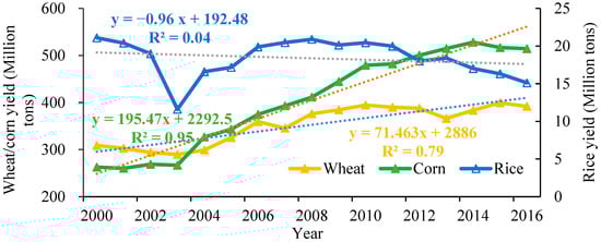 Time history variation of grain yield of major crops in the Yellow River Basin (The dashed line represents the trend line).