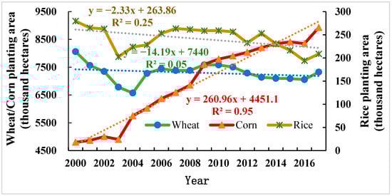 Trends in the Planting Area of Major Food Crops from 2000 to 2017 (The dashed line represents the trend line).
