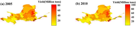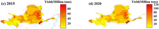 Next, based on the ArcGIS platform, we created a spatial distribution map of the main crop yields in the Yellow River Basin, as shown in Figure 7. To comprehensively demonstrate the spatial evolution of grain production under the “Five Year Plan,” this section examines grain production in 2005, 2010, 2015, and 2020 as examples, utilizing ArcGIS 10.2 software to spatially plot the crop grain production at the city level. From Figure 7, it is evident that: