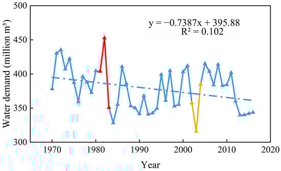 Time evolution of agricultural water demand in the Yellow River Basin during 1970–2016 (The dashed line represents the trend line).