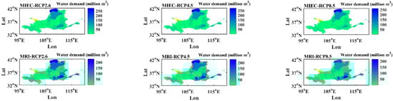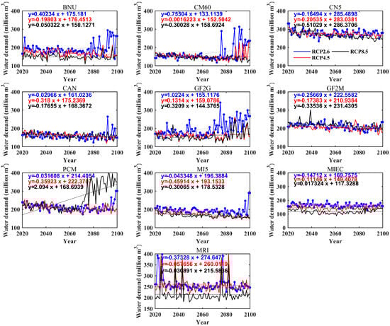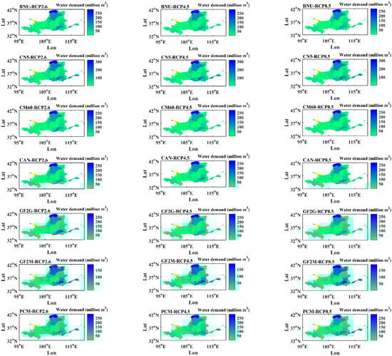 - Meanwhile, agricultural water demand under RCP2.6 in the BNU and CM60 climate models shows an increasing trend, while it decreases under medium and high emission scenarios. For example, in the BNU model, the three RCPs increase at a rate of 400 million m3/10a, decrease at a rate of 190 million m3/10a, and decrease at a rate of 50 million m3/10a, respectively;