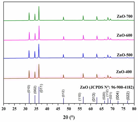 XRD spectra of ZnO calcined at 400 °C, 500 °C, 600 °C, and 700 °C.