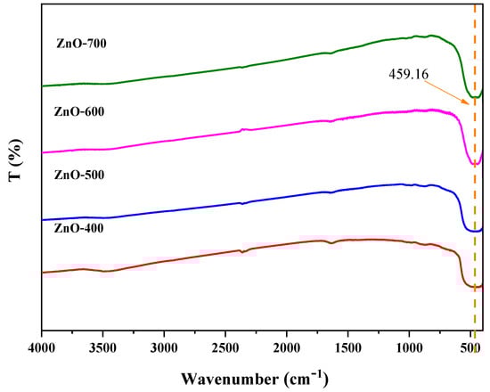 FTIR spectra of ZnO nanoparticles calcined at 400 °C, 500 °C, 600 °C, and 700 °C.