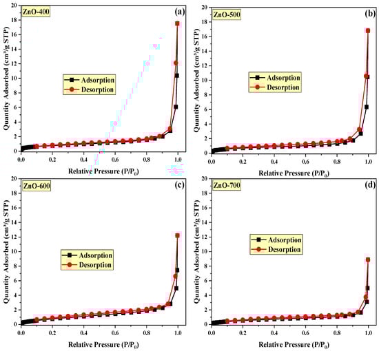 Nitrogen adsorption–desorption isotherms for synthesized ZnO samples calcined at (a) 400 °C, (b) 500 °C, (c) 600 °C, and (d) at 700 °C.