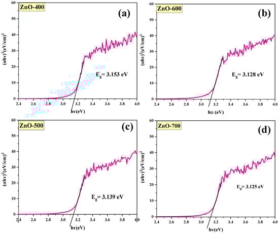 where α is the absorption coefficient, hν is the photon energy, Eg is the optical band gap energy in eV, B is a proportionality constant, n is the exponent depending on the electronic transition type, n = 1/2 n for directly allowed transitions, and n = 2 for indirectly allowed transitions [63]. The optical band gap of the ZnO nanoparticles was found to be temperature-dependent, exhibiting a decrease in band gap energy as the calcination temperature increased. The absorption maxima of the nanoparticles, calcined at various temperatures (400 °C, 500 °C, 600 °C, and 700 °C), shifted towards lower wavelengths, specifically at 371, 373, 375, and 376 nm Figure 7, respectively. Correspondingly, the band gaps were measured as 3.153, 3.139, 3.128, and 3.125 eV, respectively, as presented in Table 3 and Figure 6. These findings are consistent with various similar studies [33,63]. The observed blue shift in the band edge absorption wavelength of ZnO nanopowders produced at high temperatures is generally attributed to the presence of shallow levels within the band gap, which can be linked to impurity atoms or disruptions in the ZnO lattice [37,64,65]. However, it is suggested that this red shift is mainly due to the decrease in band gap resulting from an increase in particle size at higher calcination temperatures. This increase in particle size leads to a reduction in specific surface area, causing an increase in the coordination between surface atoms and a decrease in the coordination between surface atoms and underlying atoms. This, in turn, contributes to the observed blue shift phenomenon, attributed to the reduction in interatomic distance in the surface.
