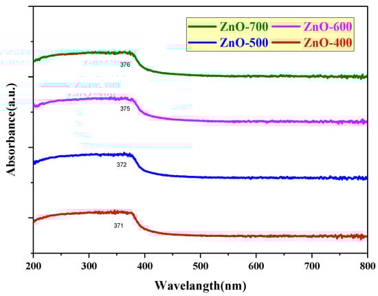 UV-visible absorption spectra of ZnO nanoparticles calcined at 400 °C, 500 °C, 600 °C, and 700 °C.