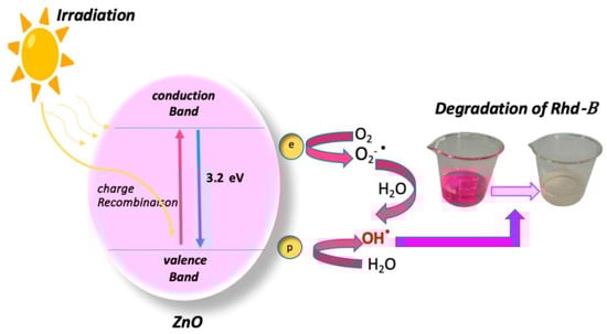 The following reactions (Equations (5)–(11)) and Figure 10 are suggested for the photodegradation of RhB by ZnO: