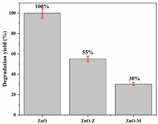 The interaction between ZnO nanoparticle samples and Rhodamine B was examined in the absence of light, and the results are illustrated in Figure 8. The adsorption capacity of ZnO nanoparticles decreases with an increase in calcination temperature. This decrease can be attributed to various factors, including heightened agglomeration (as evident in SEM data), reduced specific surface area (confirmed in Figure 2), and diminished dispersion. Moreover, the structural transformation of ZnO nanoparticles during calcination led to a reduction in surface defects [8,37], oxygen vacancies, and surface hydroxyl groups. These defects and functional groups play a fundamental role in the adsorption process, emphasizing that the control of calcination temperature enables the tailoring of ZnO materials with specific and customized adsorption capabilities.