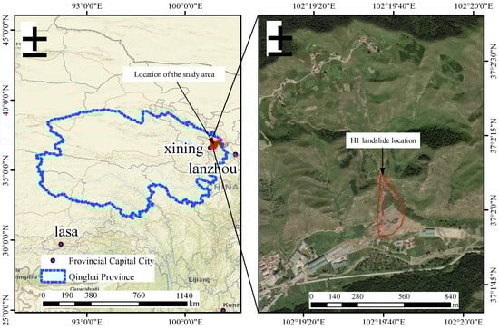 The landslide at the K21 + 700 section of the Jiaxi Expressway is located within a village in Qinghai Province, on the frontal slope of the middle-high mountains on the north bank of the Ganchangou Valley. The location of the research area is shown in Figure 1. The landslide occurred at 4 a.m. on 11 December 2021, damaging a transmission tower in the middle of the slope and causing a road fracture on the west side. Currently, this landslide primarily threatens the ongoing construction of the Jiaxi Expressway and the safety of lives and property in residential areas at the lower part of the slope, influencing the sustainable socio-economic development of the local area.