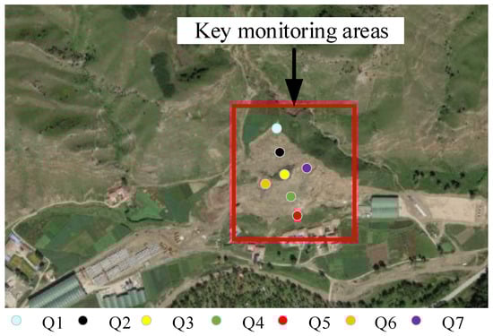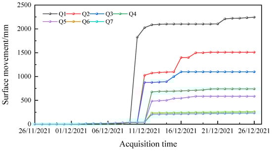 This paper analyzes field monitoring data collected over a half-month period before and after the landslide event, as shown in Figure 4. The landslide occurred on 11 December 2021, and monitoring data from the half-month before the event indicated that the landslide was in a stable state. Following the landslide, the displacements at the monitoring points can be categorized into four levels. On the day of the landslide, the displacements at the monitoring points increased suddenly, with Q1 reaching 1825 mm, and Q2 and Q3 at 1025 mm and 876 mm, respectively. The displacements at Q4 to Q7 lagged slightly in time; two days after the landslide, Q4 and Q5 displacements were 676 mm and 484 mm, respectively, while Q6 and Q7 displacements were 232 mm and 206 mm, respectively. The monitoring data show that the displacements occurred from north to south, and the displacements at the monitoring points at the top of the slope were significantly higher than those at the toe. After the landslide, the displacements at the monitoring points remained stable for a period before increasing slightly. Half a month after the event, the maximum displacement at Q1 was 2244 mm, and there were minor increases in displacements at other monitoring points. According to the construction site conditions and weather, excavation was being conducted at the slope toe before the landslide, and there was heavy rainfall a few days before the event. The combination of these two factors contributed to the occurrence of the landslide disaster. Field exploration revealed that the water supply pipes inside the landslide body were damaged to some extent, and water flowing from the water pipes into the landslide body resulted in minor movements for several days after the landslide. The monitoring data indicate that the landslide is already quite dangerous, and corresponding measures are needed to treat the slope.