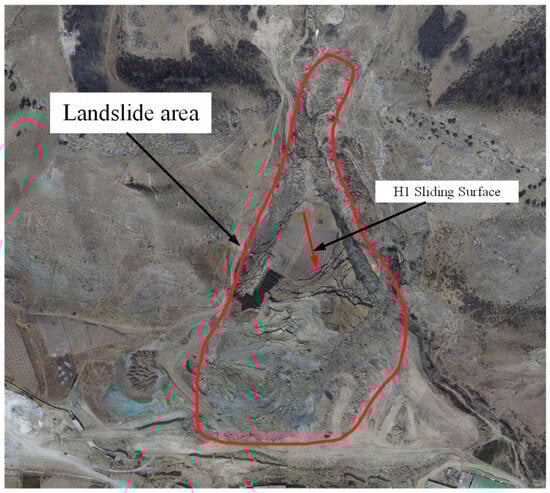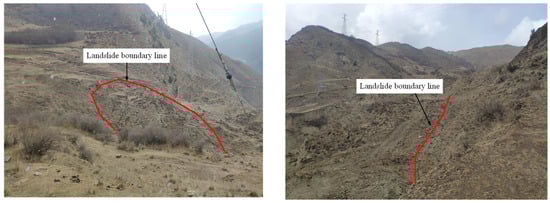 The boundary of the H1 landslide is relatively clear, with an overall irregular “tongue-shaped” planar form. The deformation and damage on the slope surface are extremely severe, with multiple tensile cracks occurring in the middle and rear edges and multiple bulging cracks in the front edge. After the deformation of the landslide, a distinct rear wall of the landslide was formed, along with chair-shaped tensile cracks at the rear edge, with an elevation ranging from 2598 to 2600 m. On the west side of the landslide, obvious tension troughs and scratch marks were formed. The tension troughs are 10 to 18 m wide and 3 to 11 m deep, basically running through the western boundary. On the east side of the landslide, a noticeable steep scarp with a setback of 0.2 to 0.6 m in height was formed. The shear outlet at the front edge is located at the excavated steep scarp of the ongoing Jiaxi Highway construction, with an elevation ranging from 2522 to 2524 m. The boundary of the H1 landslide is illustrated in Figure 6.