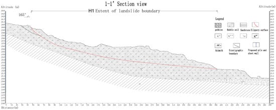 The failure mechanism and treatment measures of the landslide were studied using the finite element software FLAC3D6.0. After investigating the site conditions, the project decided to adopt a combination of slope cutting and anti-slide piles to treat the landslide. However, due to site constraints related to residents and their dwellings, only a limited number of slopes near the top area were removed to reduce the weight of the sliding mass. The anti-slide piles were installed at the location of the maximum shear strain. They penetrate through the sliding surface and are embedded into the bedrock to achieve the maximum anti-sliding force. As shown in Figure 7, a typical section 1-1′ at the landslide site was selected for analysis.